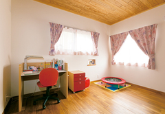 子ども部屋。壁はクロス貼りだが、収納の壁には杉板を貼るのが 『櫻工務店』の標準施工。湿気がこもりがちな場所だけにうれしい木の使い方だ外観