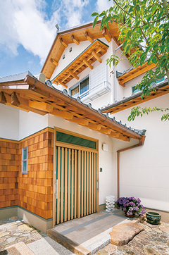 玄関の庇は、柱なしでスッキリ仕上げるため、二重垂木に。寺 社建築のような仕上がりから、大工仕事の確かさがうかがえ る。瓦は、地元の瓦屋さんに特注して焼いてもらった日本瓦トイレ
