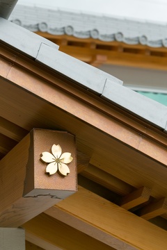 日本建築の伝統美を感じさせる屋根のディテール。屋根の下には桜の装飾が施され、繊細な職人技が光る。キッチン