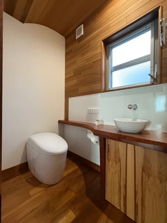 手洗いカウンターは水に強いカリンの1枚板。ヘムロック壁・アール天井・幅広チーク床で自然素材に囲まれた落ち着きのある空間玄関