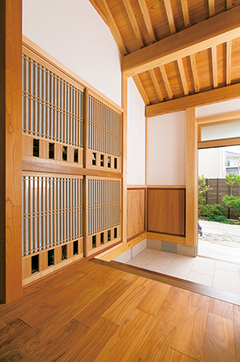 玄関の靴箱には、通気性に優れた「無双窓」の建具を使用。こちらも職人の技が 光る玄関ホール