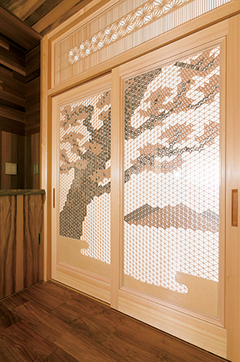 桜をモチーフにした組子の建具。1 枚作るのに1か月はかかるという見事な建具は家の価値を高めてくれる。ずっと残したい価値ある一枚だ廊下