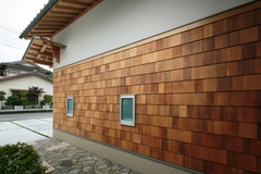 杉の柾目板鎧張りの外観。自然素材の風合いが魅力的で、周囲の景観と調和している。外観