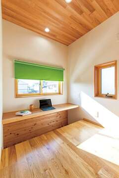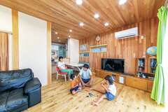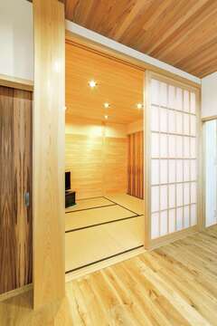 リビングに続く和室はヒノキで上品に。いつでもごろりと横になったり、子どものお昼寝やゲストルームとしても重宝家づくりの前に、自分たちが「どんな家に住みたいのか」を確かめるために、まずはたくさんの家を見たというIさん。住宅展示場や見学会を回るうちに、木の家への思いが強まった。そんな中で出会った『櫻 工務店』は、打ち合わせから施工まで棟梁が一貫して行うところに惹かれた。「木を知り尽くした櫻井さんの話は面白くてためになった」とIさん。勉強熱心なIさんは、同社の見学会やOB宅に何度も足を運び、自ら間取りを考えるほどに。そのプランを基に、プロの工夫や技を加えて完成したI邸。アウトドアやスポーツが趣味の家族の願いを叶えた大きな土間収納や、土間から風呂、LDKへと回遊できる動線など、生活が便利に楽しくなる工夫でいっぱいだ。スギ、ヒノキ、ケヤキなど、適材適所で木の良さを魅せている。「木の家でのびのびと子育てがしたい」その夢が叶ったことは、子どもたちの弾ける笑顔が教えてくれた。。