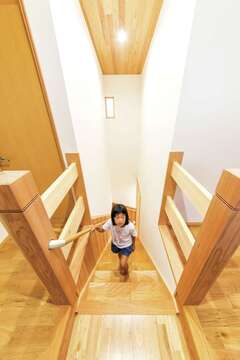 階段には賢くて丈夫なケヤキを使用。2階ホールからは、主寝室へ、子ども室へと動線が分かれている和室