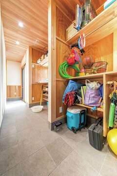 玄関を入って左側に位置する大きな土間空間。靴や上着など日常の玄関収納と、キャンプ・アウトドア用品を収納するスペースに分かれており、たっぷり収納できる廊下