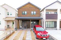 外壁は重厚感のあるタイルと杉の羽目板張りで仕上げています。リビングにもタイルを貼り、吹き抜けの梁もアクセント。ヴィンテージスタイルを気に入っていただきました。
