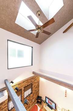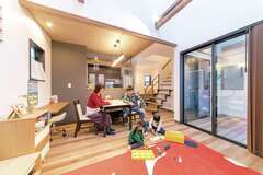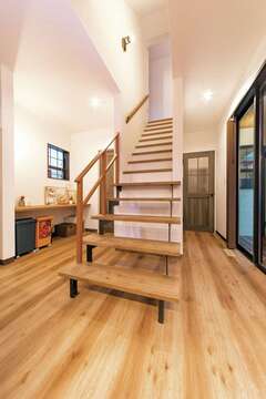 レンガ調のタイルに、時を経たようなエイジング加工の木材を用いて、外観、内装ともにヴィンテージスタイルにまとめた、「プレゼンハウス」。どんな家に住みたいか具体的なイメージがなかったというOさんだが、「この家で、私たち家族が暮らす姿が想像できたんです」と夫婦揃って振り返る。落ち着いた雰囲気のインテリアもさることながら、実際にキッチンに立った時に、より暮らしやすさを実感できたようだ。子どもの様子を見守りながら家事ができる動線を熟慮して作られた間取りは、注文住宅で多くの施主さんの希望を叶えてきた同社ならではの提案力が際立つ。隣家が接して建つ南側にあるリビングは、吹き抜けから光が差し込むため、夕方まで充分に明るい。光熱費の節約にもなり、これも家族に優しいポイントだ。