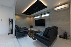 ガレージ、洗練された空間、平屋のような利便性。20年前の1棟目も手がけた『サンワ開発』が、そんな希望を抱いたSさんの期待に応えた。玄関からモダンな空間が連続し、DKは隠せる収納がキレイに貢献。ダウンフロアのリビングに設えたプロジェクターと間接照明がくつろぎを生む。ガレージにはバーカウンターを用意。ホテルのような上質感が日々の疲れを癒やしている。