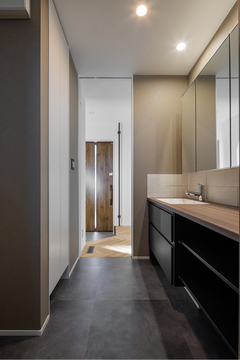 夢を叶えるために、SNSや雑誌で徹底的に家づくりの勉強をした奥さま。外観も内装もグレージュを基調としたシンプル&スタイリッシュなデザインで統一。玄関から洗面室、ランドリー、浴室へと直接つながる家事ラク動線と適量適所の収納が子育て夫婦の家事時間を短縮する。ネットで購入した照明、洗面ボウル、メッセージボードなど施主支給も多く、こだわりがすべて詰め込まれている。また、『タクト』ならではの高い断熱・気密・換気性能により、家中どこにいても温度差がなく、空気のきれいな居住空間を実現した。「大石社長がわがままを全部聞いてくれました」とほほ笑む奥さま。家づくりの満足度は自分たちの勉強量に比例することを、住んでみて実感したそうだ。