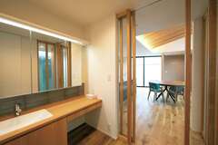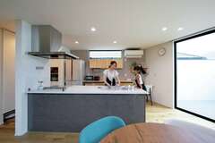 21畳強のLDKは、勾配天井を採用したことで、より広く感じられる。北側に設けた高窓は暗いのではと思いきや、十分な明るさをキープできる。キッチンからパントリー、ファミリークローゼット、ランドリー、脱衣室、洗面室へと回遊できる動線が家事時間を短縮する