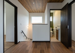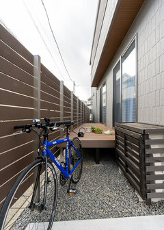 『寺田工務店』の完成見学会に参加して、「デザイン・性能・コスパ」のバランスが気に入って契約したMさん。全体的に落ち着いた色のトーンでシンプルにまとめつつ、アイアンや真鍮、ウッド系といった異素材をポイントに使うことでスタイリッシュな印象に。また、ご主人の趣味の自転車を保管できる広い玄関ホールや、生活のメインとなるLDKなどに、適所適量の収納を確保。片づけやすく、生活感を出さないスッキリとした空間に仕上げている。2階はフリースペースを広めに取り、雨の日の物干しや子どもの遊び場として使用。自由度の高い空間が、将来の生活の変化も大らかに受け止める。また、HEAT20 G2グレードをクリアした高気密・高断熱性能により、エアコンを多用することなく、夏も冬も快適に過ごせる低燃費な暮らしを実現。モダンデザインのリビングと家事ラク動線を両立した1階に、多目的に過ごせる2階というバランスの良い間取りで。1年中心地よい暮らしを楽しめるM邸。おしゃれな夫婦の満足度も非常に高い一棟となった。