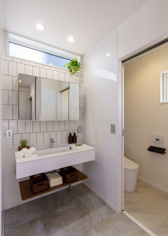 おしゃれなお施主さまのイメージに合わせて、建材などをご提案しました。断熱・気密性も高いので、定期点検の際に暖かさや涼しさ、快適さなど、お喜びの感想をいただいています。お引渡し後も、上棟のタイミングでお生まれになったお子さまの成長を楽しみにしながら、訪問させていただいています。