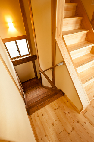 柱はすべて4 寸(12cm角)。手 間の掛かる真壁づくり(構造材を隠 すのではなく柱の間に壁をつくる) を採用する