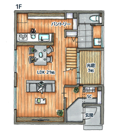 「趣味を楽しむ土間&中庭とフリースペース」「家事が苦にならないキッチン」「将来的に平屋の暮らし」「大容量収納」。いつもワクワク楽しく暮らしたいというお施主様 の理想を実現した、広い土間がある趣味を存分に楽しめる住まいです。 リビング全体を見渡せるキッチンは、家族と会話しながらお料理ができるレイアウトとし、キッチン裏に水廻り~ファミリークローゼット~寝室をまとめることで行き来しやすい家事ラク動線を実現。 日常生活の中で機能性を発揮しながらも、ゆとりを感じさせてくれる土間や中庭、緩やかでフラットなLDKが魅力の趣味と暮らす土間のある家となっています。