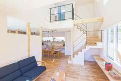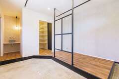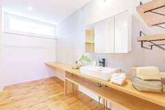 Iさんの新居は、「将来は美容室を開きたい」という奥さまの夢をカタチにした店舗併設住宅。家事と仕事をいかに両立させるかをテーマに、女性建築家ならではの創意工夫が随所に活かされている。建物の道路側には店舗の入り口を、南側には住居の玄関を配置。家族用のエントランスを入ると、アイランドキッチンに出迎えられ、右に進むと吹抜けのLDKへ。吹抜けの高窓からは柔らかな光が注ぎ、部屋中に明るさが広がる。住居と店舗を繋ぐ通路の役目を果たしているのは、ランドリールーム。住居用と店舗用の洗濯・乾燥機を2台並べて置いてあり、両方の洗濯が一気にできる。ランドリーの脇には、家族用の洗面とオープンクローゼットを並べて配置し、生活動線をショートカット。仕事も家事もテキパキこなせる家が叶い、奥さまの夢は着実に現実へと近づいている。
