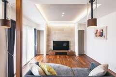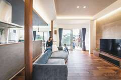玄関アプローチを格子と壁で隠したファサードがミステリアスな魅力を放つHさんの新居。1階の天井は270cmにし、廊下の幅も広くしたことで、室内全体が開放的でホテルライクな印象に。大空間のLDKは、ダブル断熱の効果で冬でも室内全体が暖かい。「光熱費も安くてびっくり。床下暖房システムで冬中寒さを感じずに過ごせそうです」とご主人。また、玄関先の6畳のファミリークローゼットから、洗面・浴室につながる動線を短縮し、日常生活と家事が効率よくできるストレスフリーな暮らしが実現。さらに、和室のキッズコーナーやデッキ&ガーデンを設け、「家族の憩いの空間が色々あるので、休日も家で楽しく過ごせています」と奥さま。これからも楽しい家族イベントが盛りだくさんに繰り広げられそうだ。