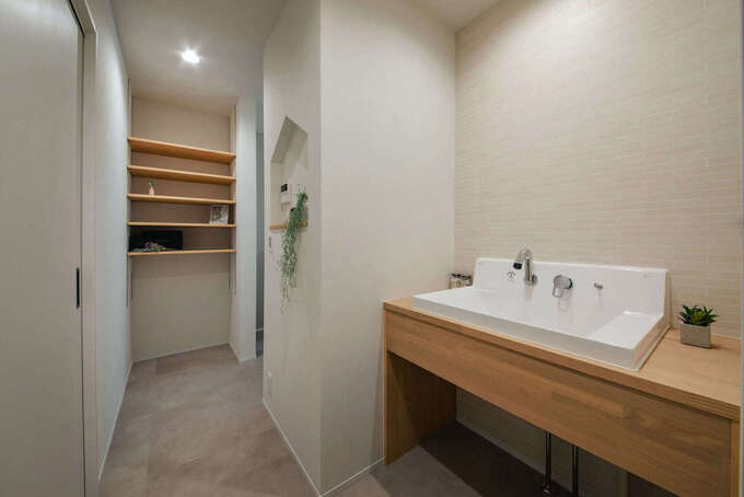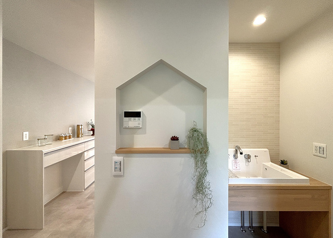 玄関から洗面室、脱衣室、浴室、キッチン、そしてLDKへとつながる回遊動線を確保。帰宅後の流れに考慮したこだわりの設計。