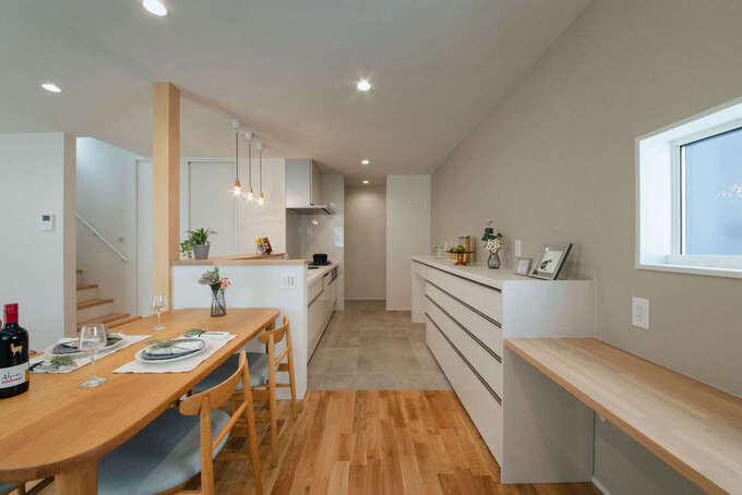 キッチンカウンターには造作棚を設け、収納力を確保。背面の造作カウンターはダイニングテーブルと高さを揃え、椅子の共有が可能。スタディーコーナーに最適だ。