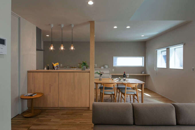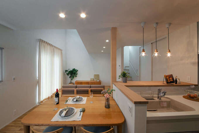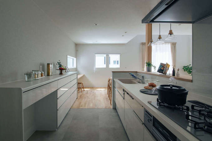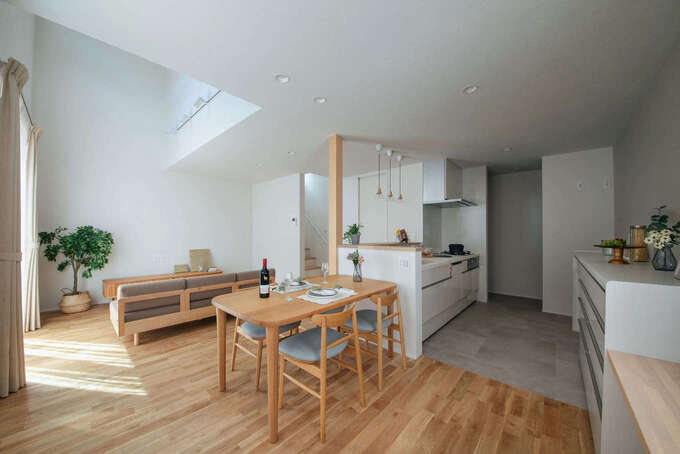 ライフスタイルを考慮して玄関から洗面室、脱衣室、浴室、キッチン、そしてLDKへとつながる回遊動線を確保。さらに各居室に出しやすくしまいやすい収納を計画しました。キッチンから家族がどこにいても目が届き、安心して子育てできる間取りに。南面には隣家があるため、リビングに吹抜けと大きな開口部を採用し、光あふれ風そよぐ快適な居住環境を実現しました。
