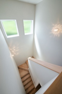 採光窓を設置して明るさに考慮した階段は、上に向かって広がるような空間に。お施主様こだわりの照明がアクセントになっている。