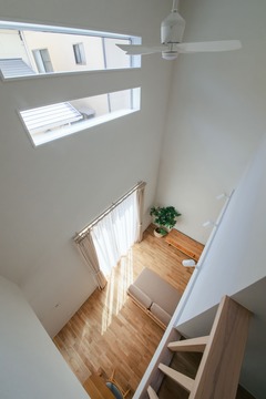 自然光をたっぷり取り入れるために工夫した窓配置と吹抜け。明るさが室内全体に広がる。
