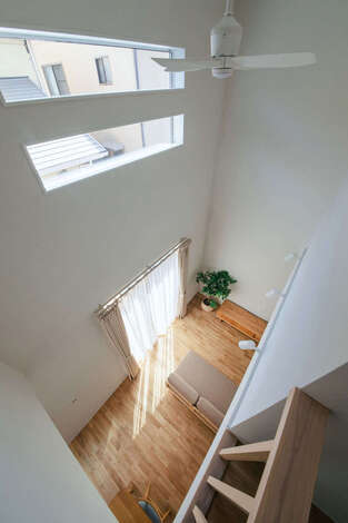 高窓と大きな掃き出し窓から奥までたっぷりと光が差し込む設計。シーリングファンは効率よく室内温度を安定させてくれる。