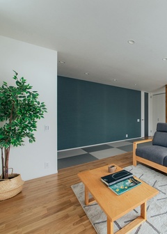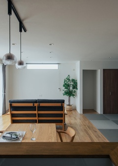 19畳のLDKに4畳の畳スペースを隣接させることで視界を広げ、空間をより広々と見せる効果も。畳スペースは仏間付きで、来客時は客間としても活用できる収納