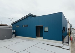 「この色がいい! 」とSさんがこだわって選んだ外壁。深いブルーのガルバリウムがスッキリとした外観デザインによく映える外観