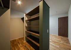 家族の居室は、部屋ごとに床や壁色を変えてコーディネート。こちらは濃いグリーンのクロスを採用して落ち着いた印象に仕上げた収納