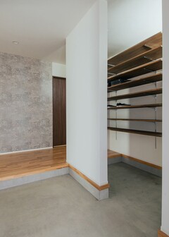 LDK近くに配置したウォークインクローゼット。「しまう」「使う」を行き来しやすいレイアウトで家事効率を高めている玄関