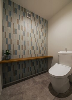 新聞が広げられる広さを想定し、1.5畳を確保したトイレ。遊び心のあるクロスが居心地の良さを演出する居室