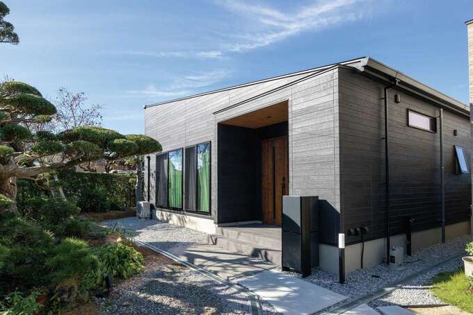 「平屋を建てたかったけれど土地に制約があったのと、お気に入りのカフェのような家にしたかったのが理由で、注文住宅を選びました」と奥さま。現在は育休中だが、フルタイムで共働きのため、デザインと同等に機能性も重視した家を希望。平屋の利便性に加えて、帰宅後にサッと手洗いができる玄関先の洗面や、洗濯が一か所でできるランドリー、リモートワーク用の書斎も設け、子育て・家事・仕事が無理なく両立できる間取りを実現した。グレーの濃淡でまとめたスタイリッシュなインテリアは、奥さまが素材を厳選。LDKを家の中心に配置したため、家族がどこにいても気配を感じ取れる。入居後は家事ラクな間取りによって時間に余裕ができ、家族時間をゆったり楽しめるようになった。