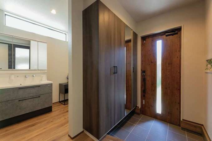 平屋ならではの機能性を追求し、帰宅後にサッと手洗いができる玄関先の洗面や、洗濯が一か所でできるランドリー、リモートワーク用の書斎も設け、子育て・家事・仕事が無理なく両立できる間取りを実現しました。グレーの濃淡でまとめた、カフェのようなスタイリッシュなインテリアにもこだわっています。