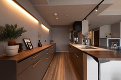 リビングのアクセントウォールを間接照明で照らし、スタイリッシュな印象に。子どもが小さいのでキッズコーナーを仕切ってあるが、空間自体が広々としているため、狭苦しさを感じない