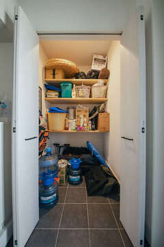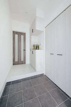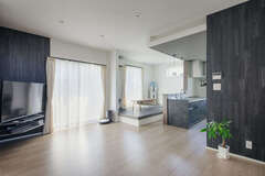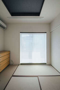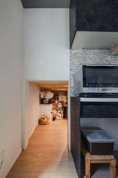 スキップフロアの下部は愛犬スペースと納戸に利用し、フロアの上下による遊び心を演出。ダイニング部分には小上がりの畳コーナーと、小上がり以外に和室も設けてあり、客間や家族の団らんに利用できるほか、将来的に夫妻の寝室として使うこともできる。水回りは玄関のそばに集約し、動線を短縮。収納スペースもたっぷり設けてある。