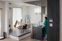 平屋に建て替えたいけれど、ありきたりではつまらない。そこで、スキップフロアのある平屋を建てることにしたGさん。スキップフロアには主寝室とウォークインクローゼット、その下には愛犬スペースと納戸を設け、遊び心が満載の平屋が実現した。室内は白を基調とした空間に黒のアクセントを用い、スタイリッシュに演出。「居酒屋風のダイニングにしたい」というご主人の要望で、ダイニングを畳敷きの小上がりスタイルにしたため、小上がりに腰掛けてカウンターで食事をしたり、お酒を飲んだりすることができる。LDKは広さが約22畳あり、愛犬も人間と同様に家中を自由に動き回れて満足気。「犬たちもスキップフロアの階段を上れるので、夜は一緒に寝室で寝ています」と奥さま。庭にはウッドデッキと人工芝のドッグランを設けてあり、愛犬たちのアウトドアライフも充実。水回りを一か所にまとめ、収納もたっぷり設けてあるので、家事ラクも実現できた。