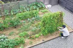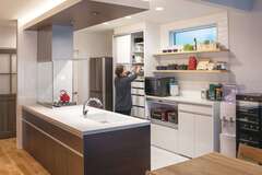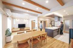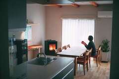 自然素材満載のつくりで、ペレットストーブの炎を眺めながら、おしゃれにディナーを楽しむご家族です。広い庭に家庭菜園もつくり、季節ごとに野菜の種を蒔き、育て、収穫するというスローライフを楽しんでいらっしゃいます。長期優良住宅認定と耐震等級3も取得した資産価値の高い住宅です。