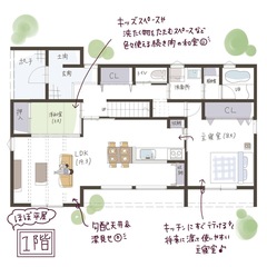 オシャレな梁見せ勾配天井のリビングに設けられた畳スペースはキッズスペースや洗濯物を畳んだり、お昼寝スペースにも使えます。キッチンにすぐ行ける主寝室は将来子供が巣立った後にも平屋として生活するにも使いやすいです。また、寝室は1階に設け、2階は子供部屋が3室の人気のほぼ平屋の間取りです。