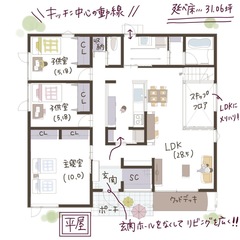 玄関からファミクロへ直行できる帰宅動線で、荷物を片づけてすぐリビングへ。 家の中心には畳コーナーを備えたLDKがあり、外とゆるやかにつながる開放感あふれる空間です。 家族それぞれの個室も確保しながら、どこにいても自然とつながりを感じられる間取りになっています。 暮らしやすさと心地よさを両立した、家族想いの平屋です。