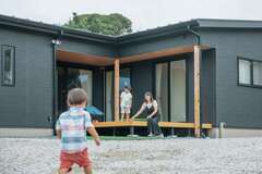 Sさん夫妻と3人の男の子が暮らす平屋には、家族の日常にワクワク感をもたらすアイデアがいっぱい。奥行きのある玄関土間の突き当たりには、ご主人の釣り具部屋を配置。「土間に竿を伸ばして仕掛けを作れるので、すごく便利です」とご主人。また、土間に面して3つの出入り口を設け、ファミリークローゼット&洗面・浴室への「ただいま動線」と、パントリーに続く「買い物帰り動線」、リビングにつながる「来客動線」を確保。「土間をフル活用して、家事も子育てもストレスフリーです」と奥さま。ヒノキの無垢床の香りとぬくもりが漂うリビングに、小上がりとスキップフロアのキッズコーナー、ウッドデッキのアウターリビングと、家族の「あったらいいな」が丸ごと備わっている。