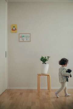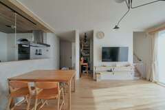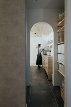 インテリアコーディネーターの資格をもつご主人と、笑顔がやわらかな奥さま。Y邸がこれほどお二人に似合っているのは、思いが確かに届いたからだろう。ナチュラルな空気感はもちろん、変形敷地を活かした計画からコンパクトな家事動線まで、夫妻が「恋人のように毎日LINEした」と話す新谷さんが丁寧に形にしてくれた。とくにLDKは快心の仕上がり。買い物の荷物は玄関間近のパントリーへ。階段下には収納兼趣味のスペース。自然に育まれていくつながり。壁には作家の絵と子どもの作品が飾られ、キッチンやリビングにはご主人お手製の棚が。この先、成長や暮らしの変化にフィットさせていくことのできるシンプルさや余白まで叶えられた一棟だ。