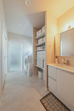 建物の南側にLDKと小上がりの和室を設け、北側に水回りを集約した間取り。玄関から洗面・脱衣スペース、LDKを回遊できる動線を確保。さらに、洗面スペースの隣にはファミリークローゼットを設け、洗濯の家事が便利に。土間収納やパントリーも設け、家事貸しやすい間取りが実現した。また、リビングの南面に収納カウンターと窓際用のカウンター、収納棚を設け、室内に明るさを取り入れつつも、リビングに必要な収納や飾り棚を確保してある。