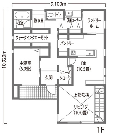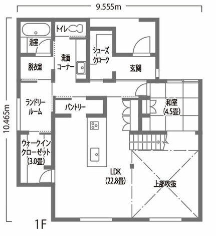 玄関ホールの吹抜けと大きなFIX窓が、家全体に明るさと開放感を届けてくれるおうちです。 LDKは折下天井で空間にメリハリをつけ、家族がゆったりと過ごせる心地よいリビングに。 ランドリールームをリビングから少し離れた位置に設けることで、生活感を見せずにすっきり暮らせる工夫も。 デザインと使いやすさ、どちらも大切にした間取りです。