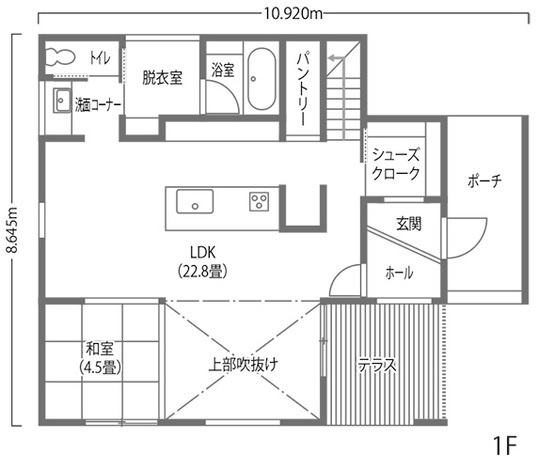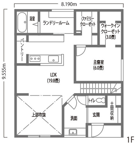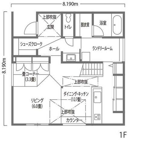 デザイン性はもちろん、家事動線にもこだわった間取りです。吹き抜けとダウンフロア、オープン階段を使用することで大きく開放的なリビングはもちろん、玄関から帰宅してファミクロ、パントリーを通ってキッチンに入る動線や回遊できるキッチンなど日々の家事が楽になる工夫があります。