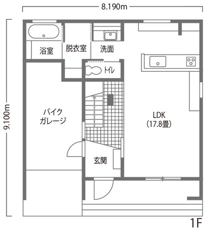 リビングからも見えるバイクガレージがこだわり。趣味のバイクガレージだけでなく、一直線の水廻り動線など、暮らしやすさにもこだわった間取りです。