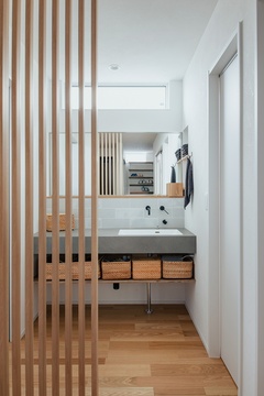 水回りを2階に持ってきたことで、限られた敷地の中でも1階のLDKを広く確保できました。洗面の隣には室内干しのできるランドリーを設け、洗濯の家事動線を画期的に短縮。また、浴室、洗面、寝室の距離が近いので、就寝時の動線もスムーズです◎