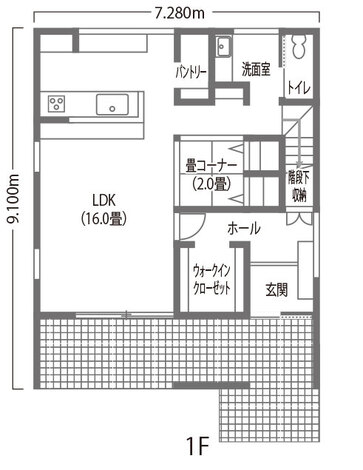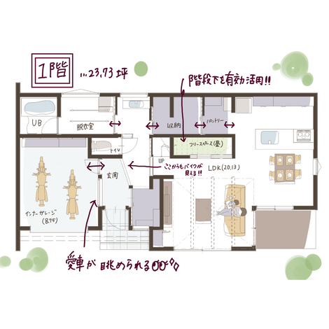 家事効率がアップできる間取りです。買い出しの重い荷物は玄関からパントリーへ直行。洗濯物はハンガーからそのままウォークインクローゼットへ。家族の時間にゆとりが生まれ、のびのびした生活が送れそうですね。 LDKは小上がりと合わせて23畳!圧倒的な開放感です。 さらに、高気密・高断熱に太陽光発電が加わって、年中快適で低燃費な家が完成しました。