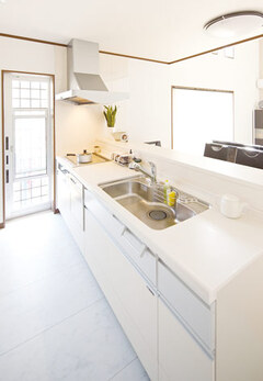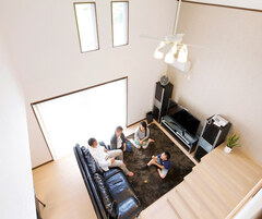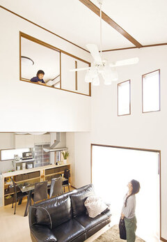 子どもの学区を変えずに新築したいと、土地探しから水田建設に依頼したHさん。「120%満足しています」。瞳を輝かせて何度もそう語るご主人は、湖畔に完成した和モダンの家が愛おしくてたまらない様子。白で統一した室内は、吹抜けのリビングを中心としたオープンな間取り。家族それぞれに個室を設けたが、キッチンに立つ奥様からは全員の気配を感じられる。子ども部屋のロフトは長男自慢の秘密基地で、毎日のように遊びに来る友達にも大人気。ご主人の部屋から続くベランダは夏の花火の特等席だ。「真冬でもほとんどエアコンなしで過ごせました」と奥様。頑丈な金物工法によって強い耐震性と高気密高断熱を実現した住まいは、快適な住み心地とともに省エネ効果ももたらした。このデザイン性と暮らしやすさで1000万円台とは、子育て世代にとって何よりありがたい。
