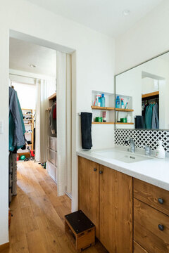 なごやかに家族やゲストを出迎える玄関。開放的なリビング。せっかくの上質空間も、あわただしい子育て世帯にとっては整然さを「保つ」ということがとても難しい。この家には、ありがちなそんな悩みを解消する工夫がこらされている。まずは玄関。リビングへと向かうメイン動線のほかに「裏動線」がある。裏動線のスタートはシューズクローク。下がり壁でゆるやかに仕切られ、子どもの三輪車まですんなり収まる。一歩入れば稼働棚と衣類用収納が一直線に続く。適切な収納のおかげで、雑然としがちな玄関もいつもすっきりとしている。オープンキッチンに吊り棚はなく、奥側の窓から光が入る。リビングとの一体感も気持ちいい。カップボード、パントリーに加え、クローゼットのような折れ戸の収納を備え、キッチン回りにあふれるモノを目立たない形で収めている。「ウッドデッキは、子どもがもう少し大きくなってから活用できるかな」この先も、この家とともに描く家族の顔は笑っている。